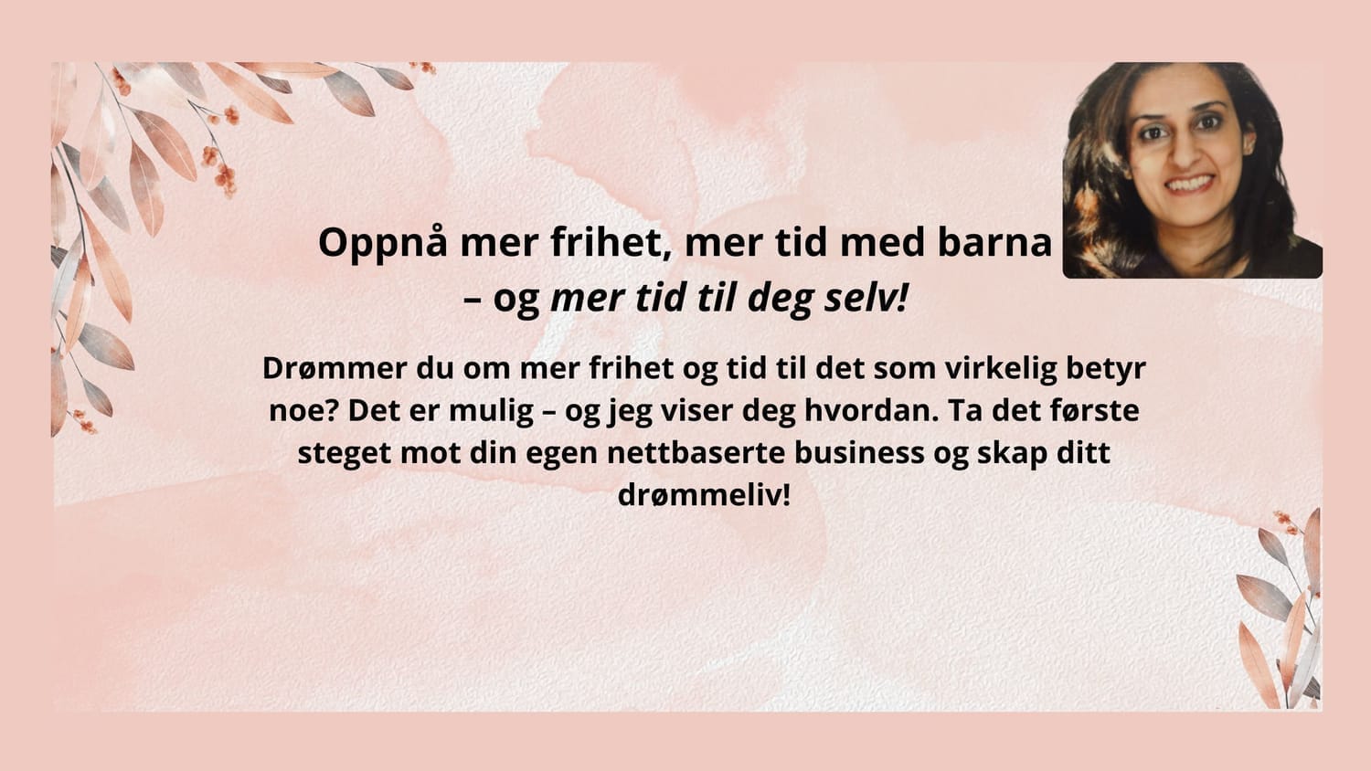 Hei! Jeg heter Saira, og jeg er mamma til to flotte gutter som betyr alt for meg. Jeg jobber i et firma hvor jeg trives veldig godt, men jeg har lenge stilt meg selv et viktig spørsmål: Vil jeg jobbe slik resten av livet? Og: ønsker jeg en jobb som gir meg mer frihet og tid til å være sammen med familien min? Svaret var klart, og nå jobber jeg mot en hverdag med mer tid og frihet!